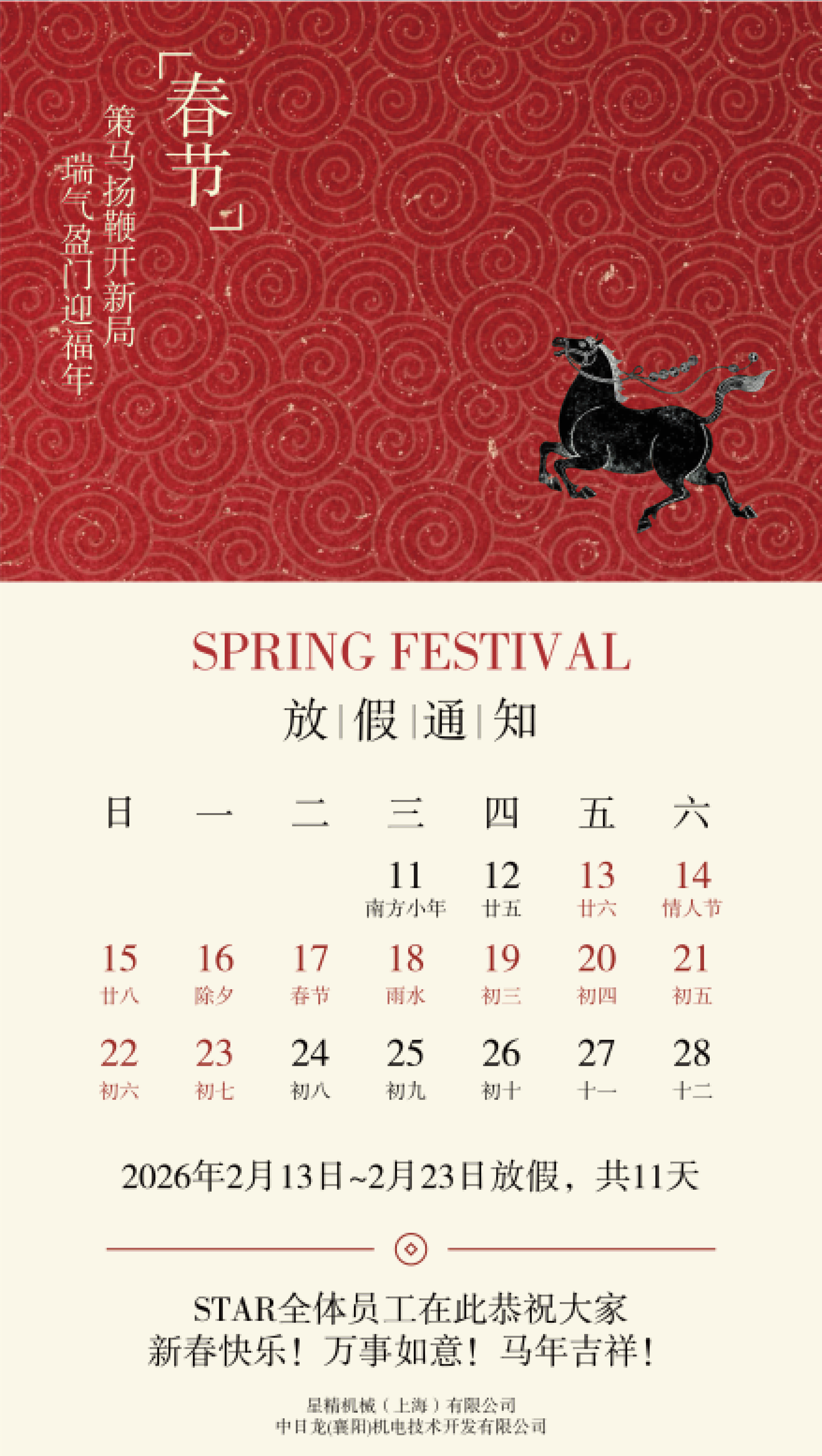 感謝大家一直以來的支持與關照。STAR中國集團根據春節假期情況,安排于2026年2月13日(臘月廿六)~2月23日 (正月初七)放假,2月24日(正月初八)正式上班。
